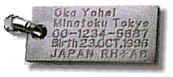 データ部分には住所、氏名、TEL、国籍、血液型、生年月日が彫刻できますので、まさに海外出張や旅行の必需品といえそうです。また、オーダーによりプレゼントメッセージも入れられますので、出産や就職などのお祝いにもどうぞ。もちろん純チタン製ですから、金属アレルギーの人にも安心して使えます。